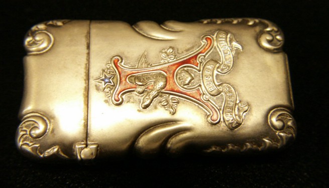 description: Anheuser Busch German silver match safe. Red and blue Cloisonne' A & Eagle with a ribbon "Anheuser Busch St. Louis" logo. Flip top attached spring loaded lid and a match strike on the bottom. The reverse side is plain. information: Match safes were very popular among gentlemen because they were a small stick match holder which provided a dry and clean storage container for use in pants and vest pockets and a match striker on the bottom. |