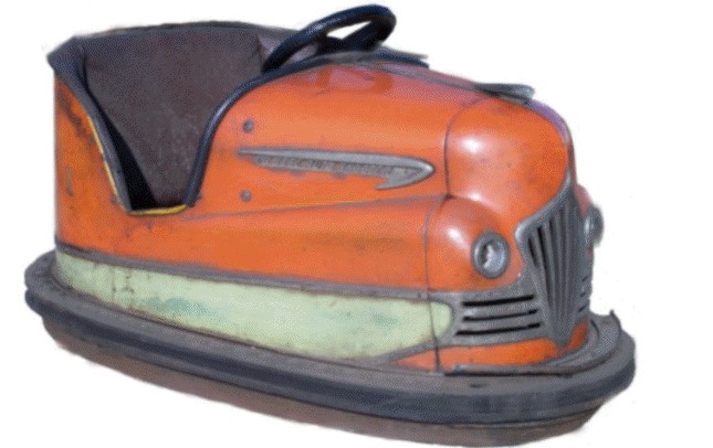 description: Amusement park electrically powered front wheel drive bumper car. Fashioned after late model automobiles of the period with head and tail lights completing the realistic automotive design. Trolley pole with electrical contact is located on the rear of the car. information: