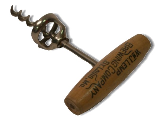 description: Wood handled cork screw, silk screened with the W. J. Lemp logo and the instructions "Don't Pull, Turn Until Cork is Out!" |