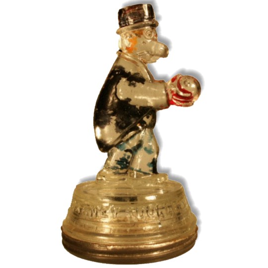 description: Barney wearing a top coat and hat, holding an apple and standing on top of a barrel. The glass base is embossed: Barney Google, copyright 1923 King Feature Syndicate, Inc. Original screw on tin lid. Barney Google is one of the longest running comic strips in history. Created by Billy DeBeck in 1919. In 1942 Barney was inherited by DeBeck's assistant Fred Lasswell, who drew the strip until 2001. |