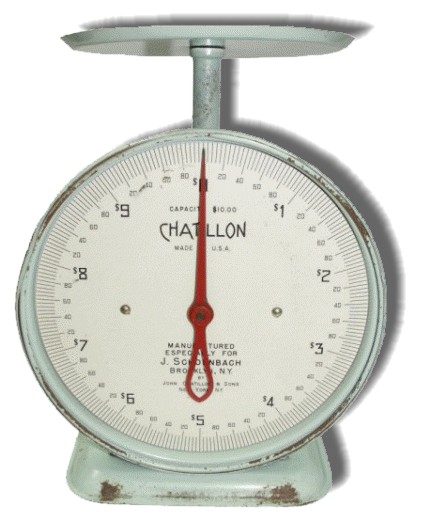 description: Chatillon penny weighing scale with dollars and cents nomenclature with ten dollar capacity. Chatillon and Sons manufactured this scale for the J. Schoenbach Company of Brooklyn, New York. |