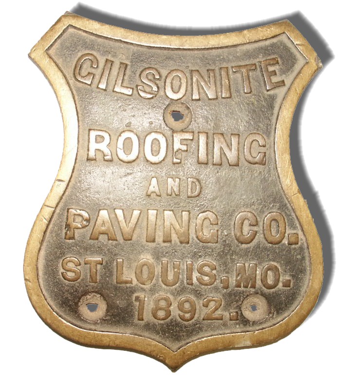 | description: "Gilsonite Roofing and Paving Co. St. Louis, MO. 1892." Cement contractors brass embedded plaque. | |