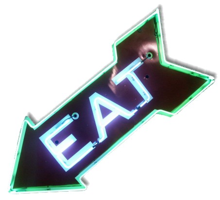 | description: Double sided "EAT" neon sign in the shape of an arrow. Restored, repainted, rewired and did not use the original style pk's. | |