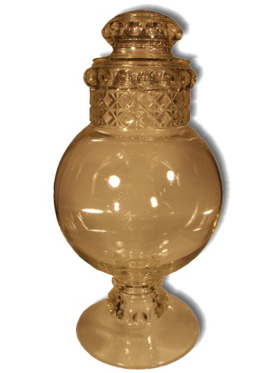 | description: Footed, 7" globe bodied, 3 1/2" mouth opening candy jar with glass stopper. We also have two 8" candy globes that are of the same style as this one, they are AW item #'s 2003.065 and 2003.066. | |
