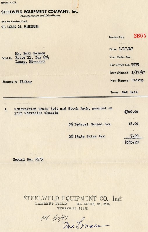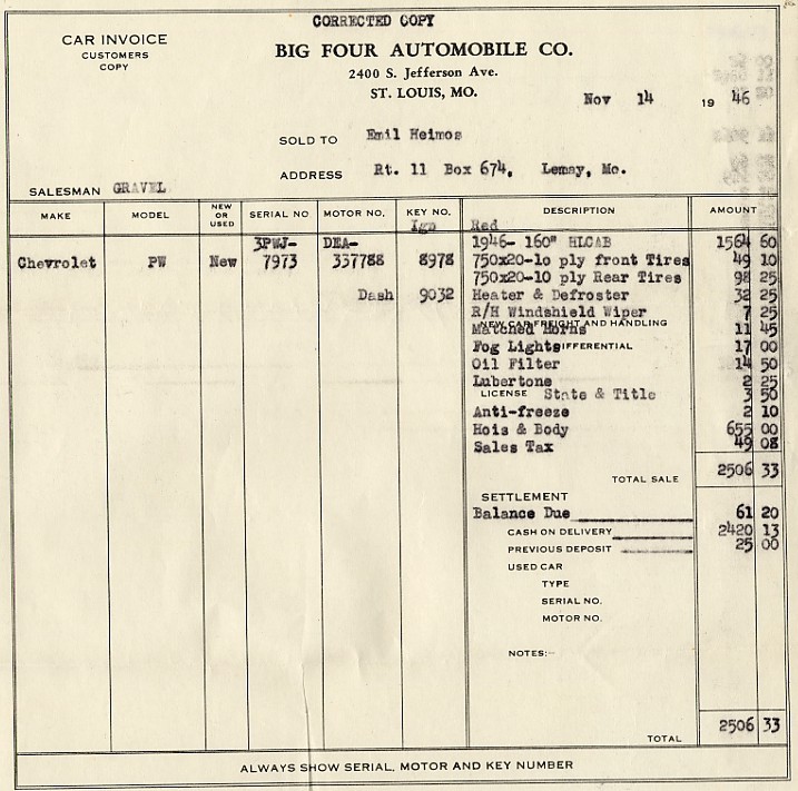 The featured item is a 1946 Chevrolet 6400 series, stake body truck, with a hydraulic bed hoist. This heavy duty 2 ton utility cab and chassis has been meticulously restored to perfection. The original owner, Emil Heimos of Lemay, Missouri utilized the truck for his sheep farming operations at Montadale Farms. Heimos purchased the truck from Big Four Chevrolet, located at 2400 South Jefferson Avenue, St. Louis, Missouri, on November 14, 1946. The new truck replaced his smaller and out dated 1929 Chevrolet. Heimos' eldest son Norman applied for the new vehicle from the U. S. Government upon his return from serving in World War II. Servicemen were given favorable considerations for almost unavailable new vehicles at the time. Norman Heimos claims “the Chevrolet truck was the first new truck delivered in South County after the war”. On January 17, 1947 Heimos had grain sides and stock rack installed by the Steelweld Equipment Company, Inc. for the total sum of $385.20 this included a 5% Federal excise tax and a 2% State sales tax (click here to see the original invoice). The Load Master engine is a straight six with 235.5 cubic inches, 192 foot pounds of torque and 30.5 horsepower. A four speed transmission with provision for power takeoff and a two speed rear end; with high and a low. This PW series truck has a 160 inch wheelbase and is 259 inches in length. It is 88 inches wide and 78" tall. The maximum gross vehicle weight is 15,000 pounds. The front suspension consists of a nine leaf front spring, with a 640 pound per inch deflection rate. The rear has a 10 leaf main plus a six leaf helper, and a deflection rate of 2300 lbs. per in. The tires are 750 by 20-10 ply (8 ply came standard) and were single in the front and dual in the rear. The original base price of the truck was $1564.60. With options the total came to: $2506.33, which included a $3.50 state & title license fee and a $49.08 sales tax (Click here for an original scan of the invoice). The options on this truck included, 10 ply tires, heater/defroster, right hand windshield wiper (left hand wiper came standard), matched horns, fog lights, oil filter, Lubertone, anti-freeze, and hoist & body. The hoist and body created the ability to raise the front of the bed up to dump a load, similar to a dump truck. The hoist a Speedlift type 7-DL, serial number 10154 was manufactured by Daybrook Hydraulic Corporation, Bowling Green, Ohio. Today the truck is used as a promotional vehicle for Nu Way Concrete Forms, Inc. in St. Louis, Missouri, and is on permanent display at the Antique Warehouse. When the truck was restored the grain sides and stock rack were omitted and replaced by wooden stake sides made of oak. Below are a few images of the truck as looks it today. If you click on any of these images you will be taken to the index page, where you can view larger images.